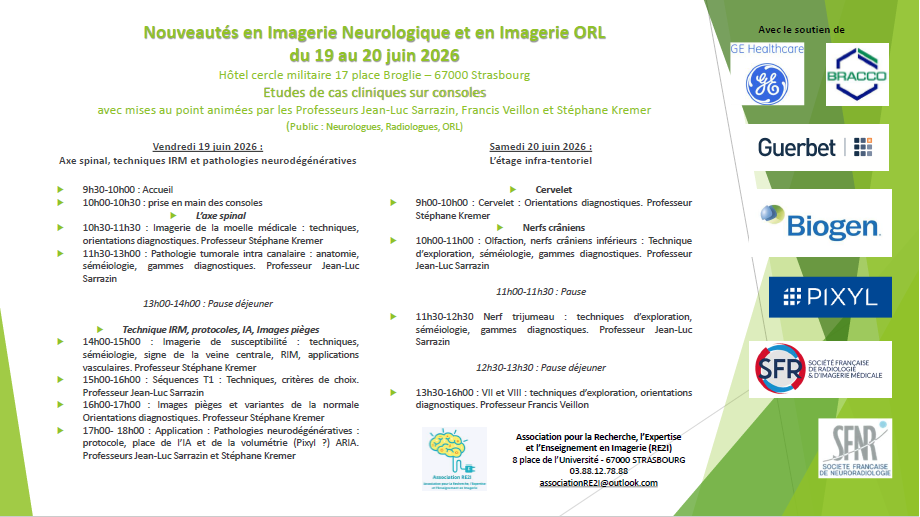 Retrouver les Nouveautés en Imagerie Neurologique et en Imagerie ORL organisé les 19&20 juin 2026 à Strasbourg, par le Professeur Jean-Luc SARRAZIN de l’Hôpital Américain de Paris, les Professeurs Francis VEILLON et Stéphane KREMER du CHRU de Strasbourg propose sur 2 jours des études de cas cliniques sur consoles avec mises au point.